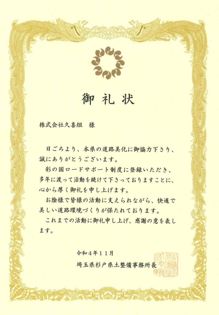 埼玉県杉戸県土整備事務所長様より、ロードサポート活動に対する御礼状をいただきました。