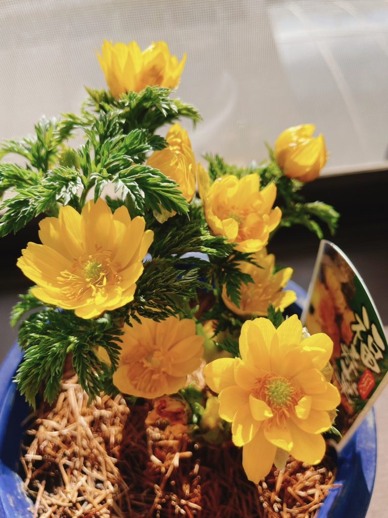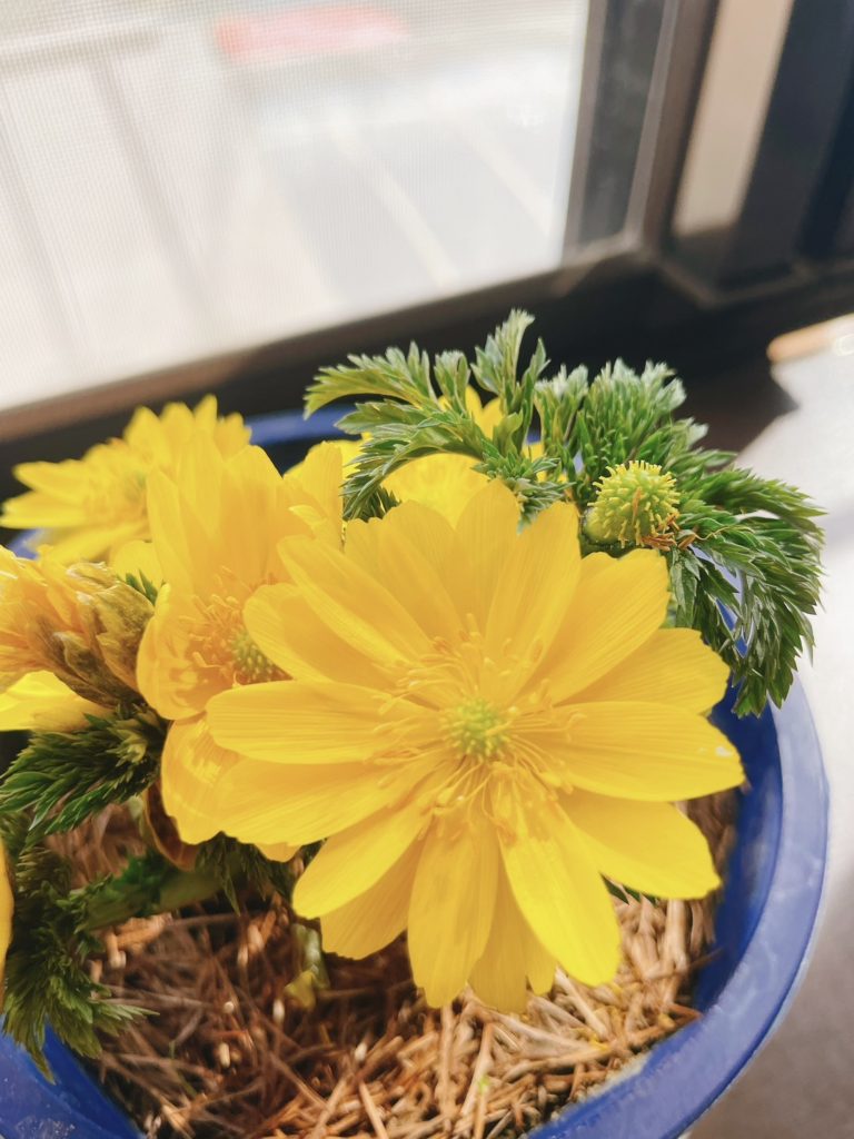 事務所の窓辺に、社長の奥さんが飾ってくれた福寿草のつぼみが開いてきました。