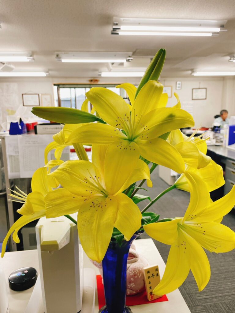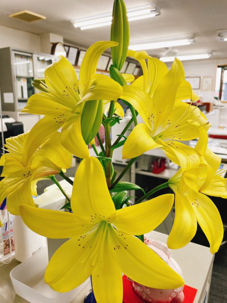 社長の奥様が、お友達の自宅で咲いているユリの花を事務所に飾ってくれました。梅雨の季節にレモンイエローの花の色がとても爽やかです。